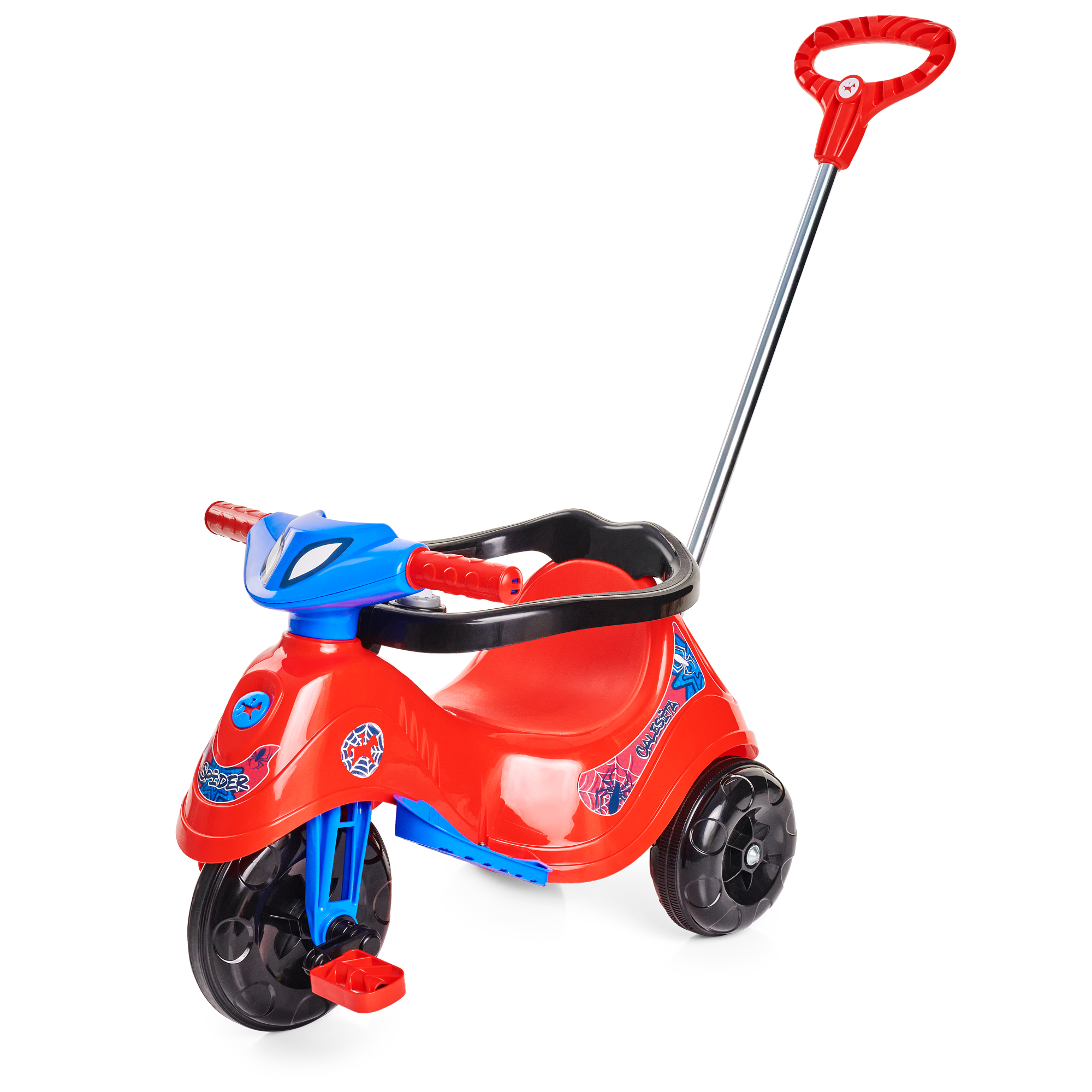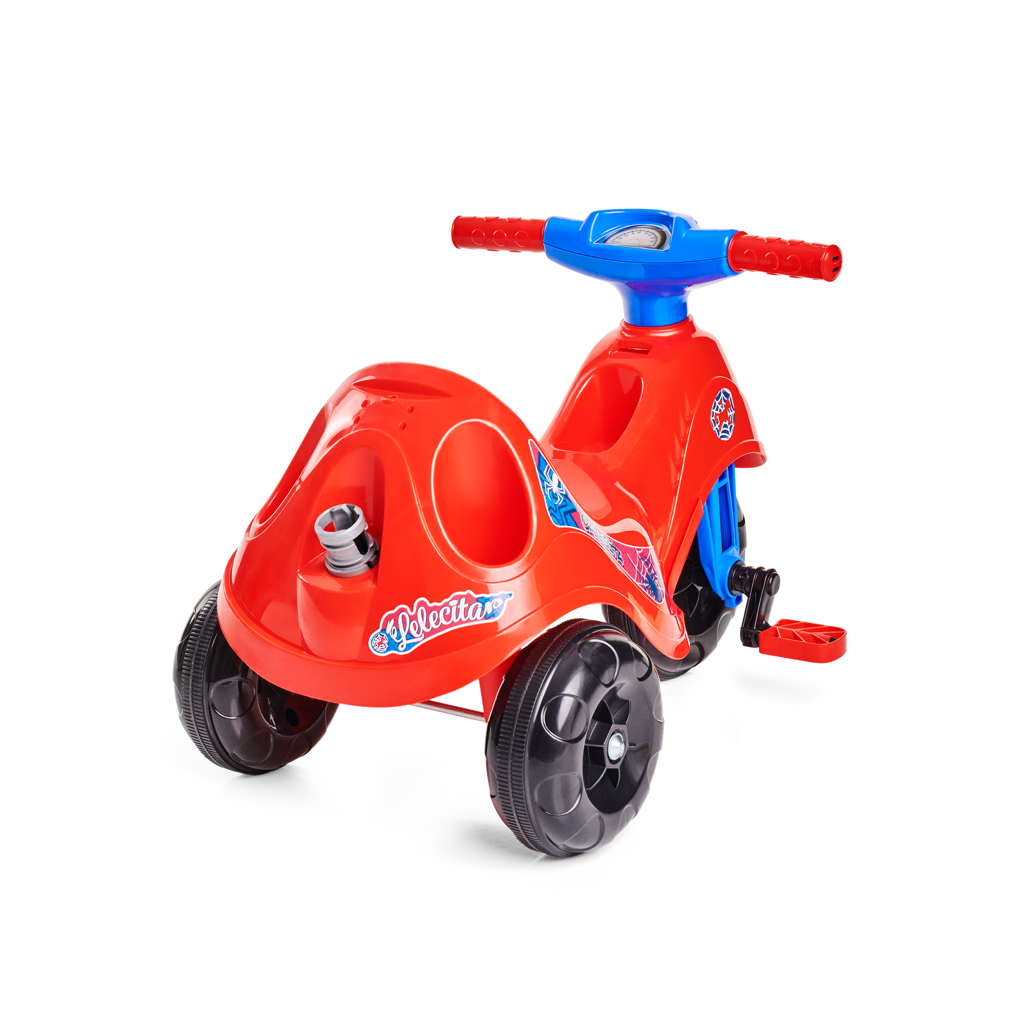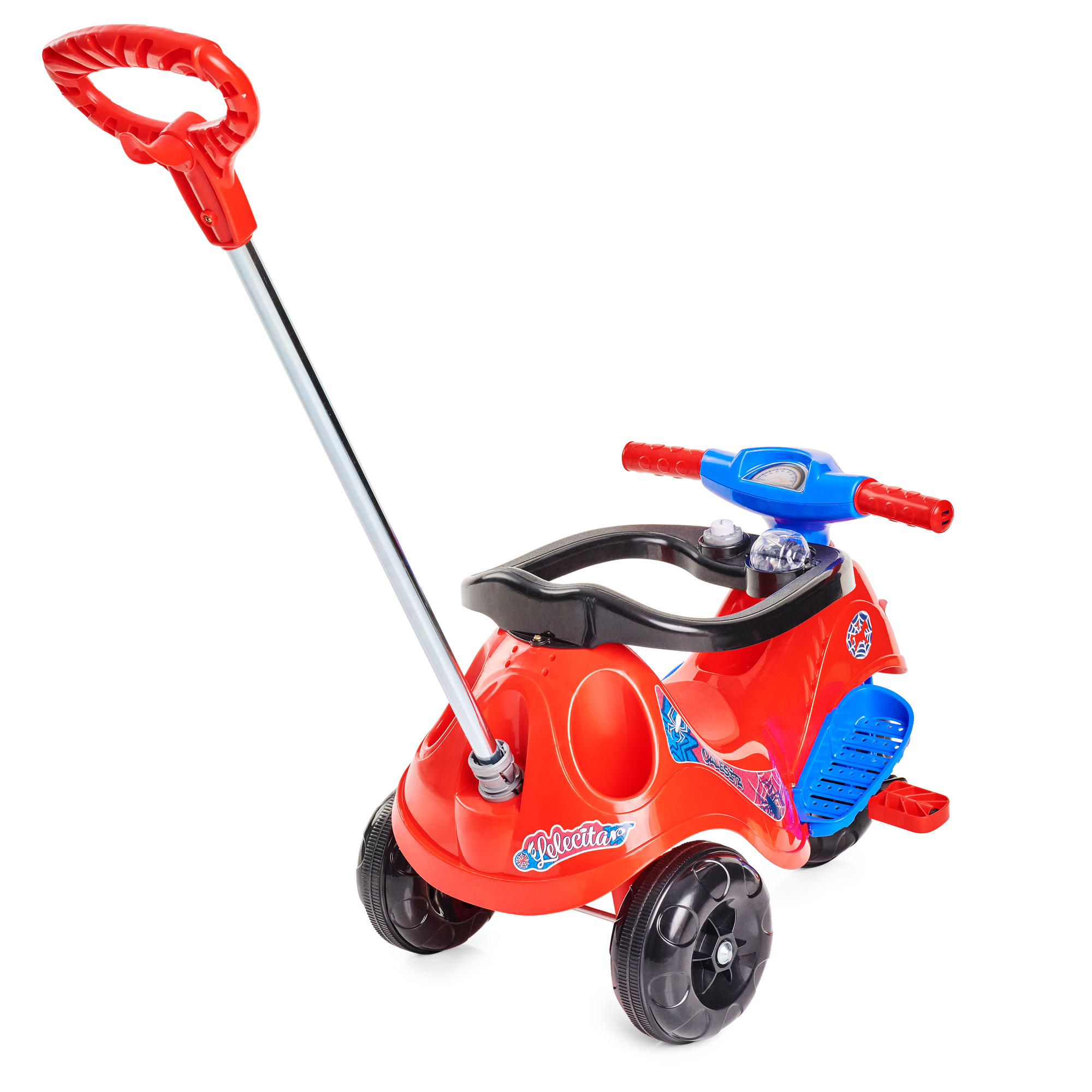 Ele tem direção e rodas guiadas pelo empurrador, vem com apoio de pé e aro protetor removível. E suporte para bolsa no empurrador. A Lelecita Spider acompanha o crescimento do seu herói! Nos primeiros passeios, pode ser usado na versão passeio com todos os acessórios, e quando o seu pequeno estiver pronto para novas aventuras, é só retirar o aro protetor, o apoio de pé e o empurrador. Elá também possui roda com borracha antiderrapante, e também um suporte para guardar a garrafinha ou mamadeira.