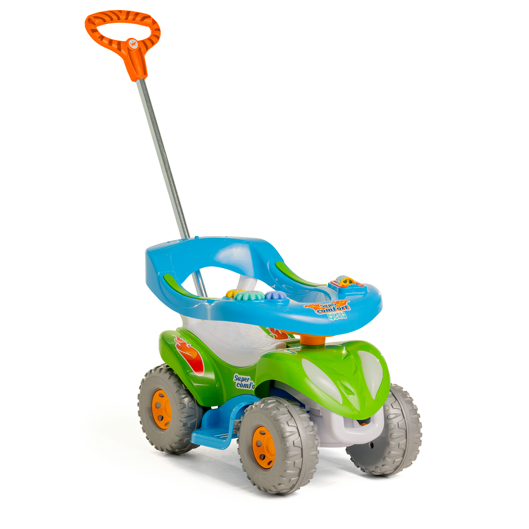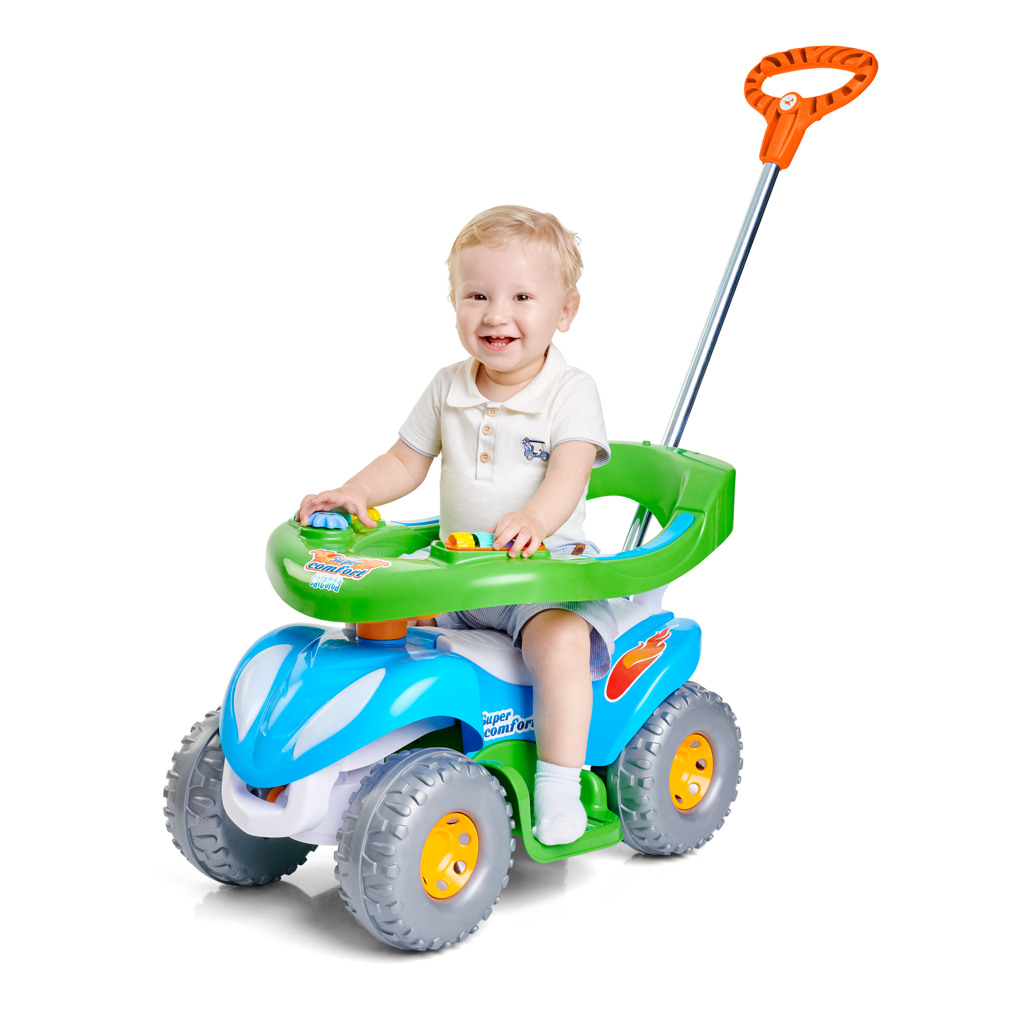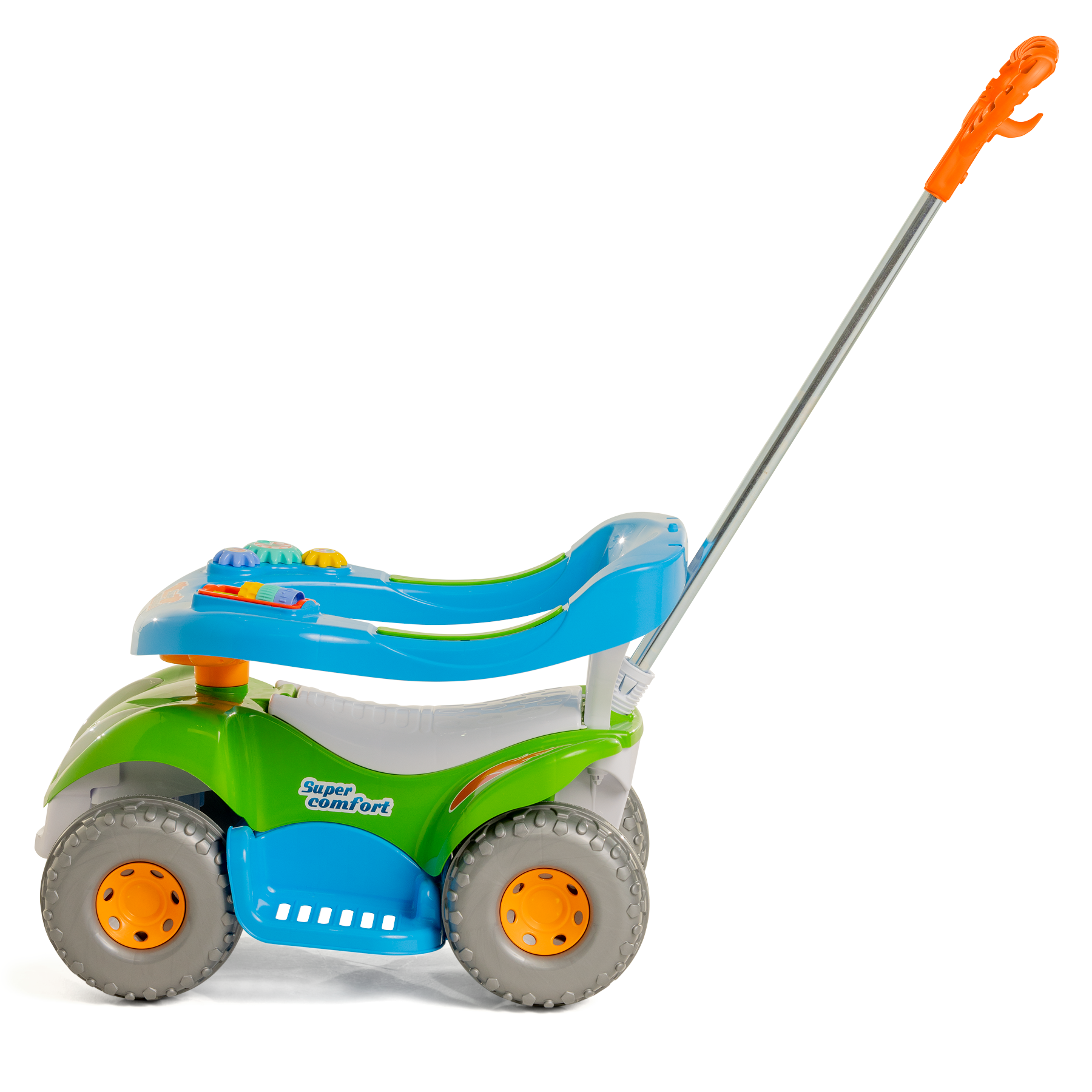 A diversão vai além da versão passeio. Para a diversão continuar com a versão passo a passo, é só desencaixar o aro protetor, retirar os apoios de pé e a haste.