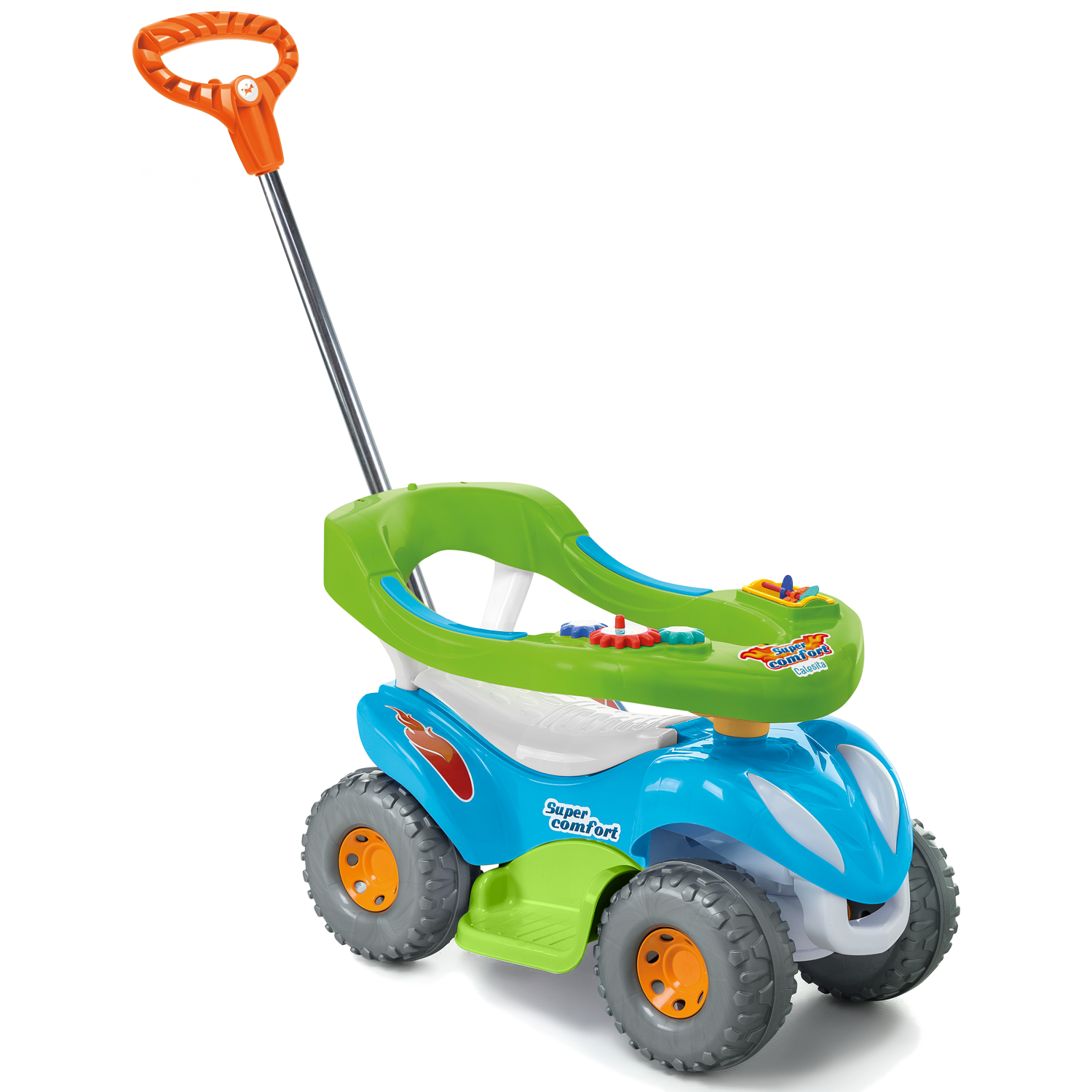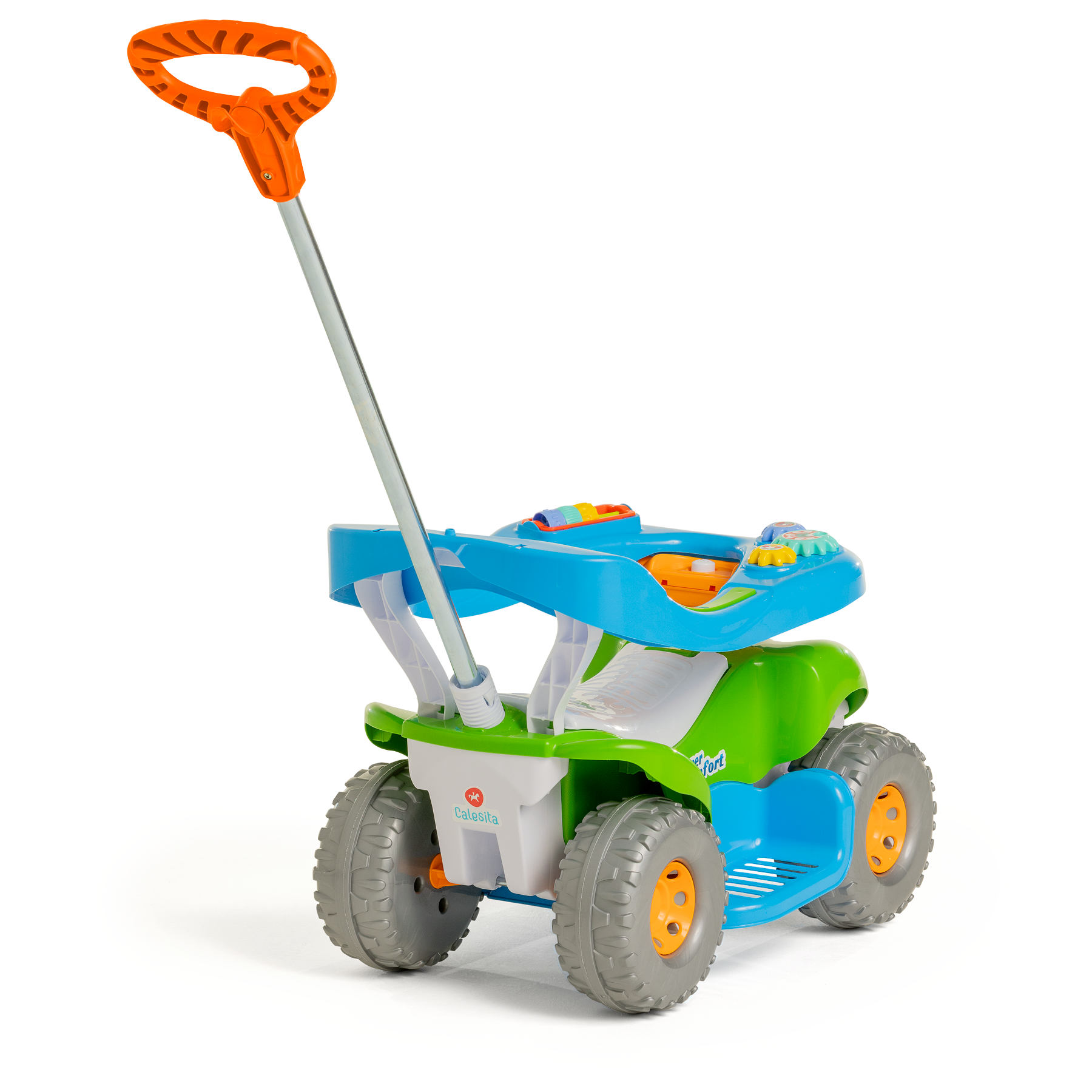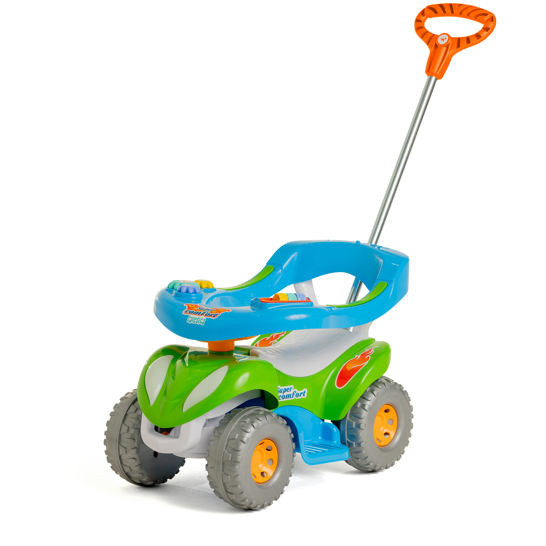 A diversão vai além da versão passeio. Para a diversão continuar com a versão passo a passo, é só desencaixar o aro protetor, retirar os apoios de pé e a haste.
